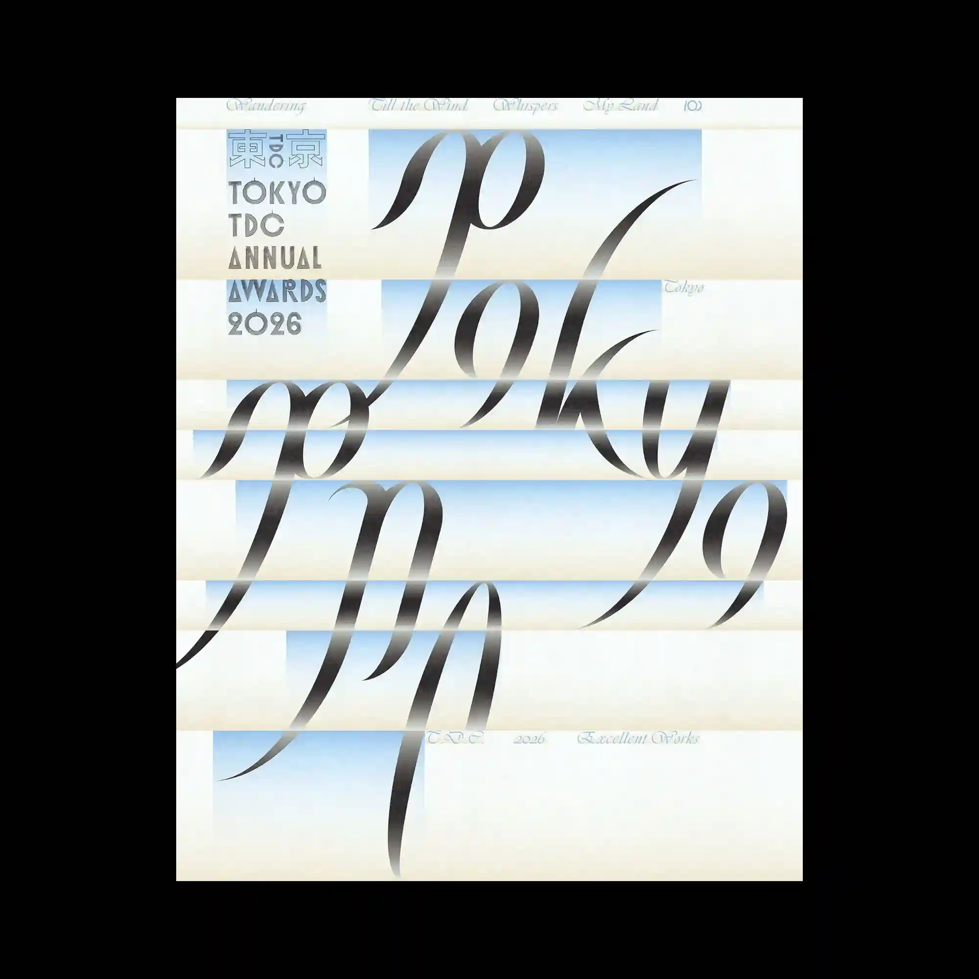 A large italic serif word is expanded across the composition, with its letterforms stretched and flowing diagonally through the layout. Horizontal bands cut across the surface at regular intervals, slicing the typography into segmented layers while maintaining overall continuity. The soft gradient within the bands transitions between light blue and neutral tones, adding depth behind the dark letterforms. The composition creates a rhythm between interruption and continuity through the interaction of slicing and fluid typography.