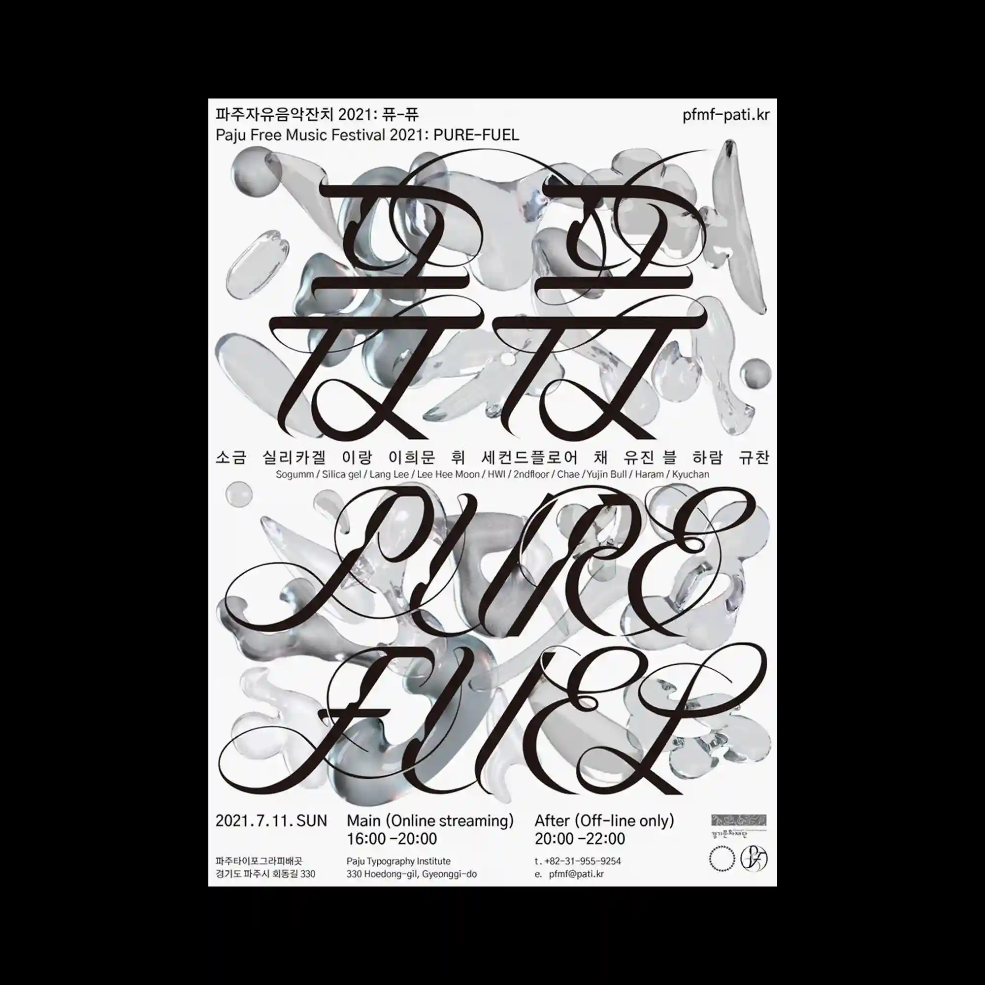Large flowing serif typography spans across the composition with exaggerated curves and extended strokes, forming a dominant visual layer. Behind the text, semi-transparent amorphous shapes resembling liquid glass are scattered, creating depth through overlap and refraction-like distortion. The contrast between sharp typographic edges and soft organic forms enhances spatial layering. The layout integrates expressive typography with translucent volumetric elements, resulting in a dense yet balanced composition.
