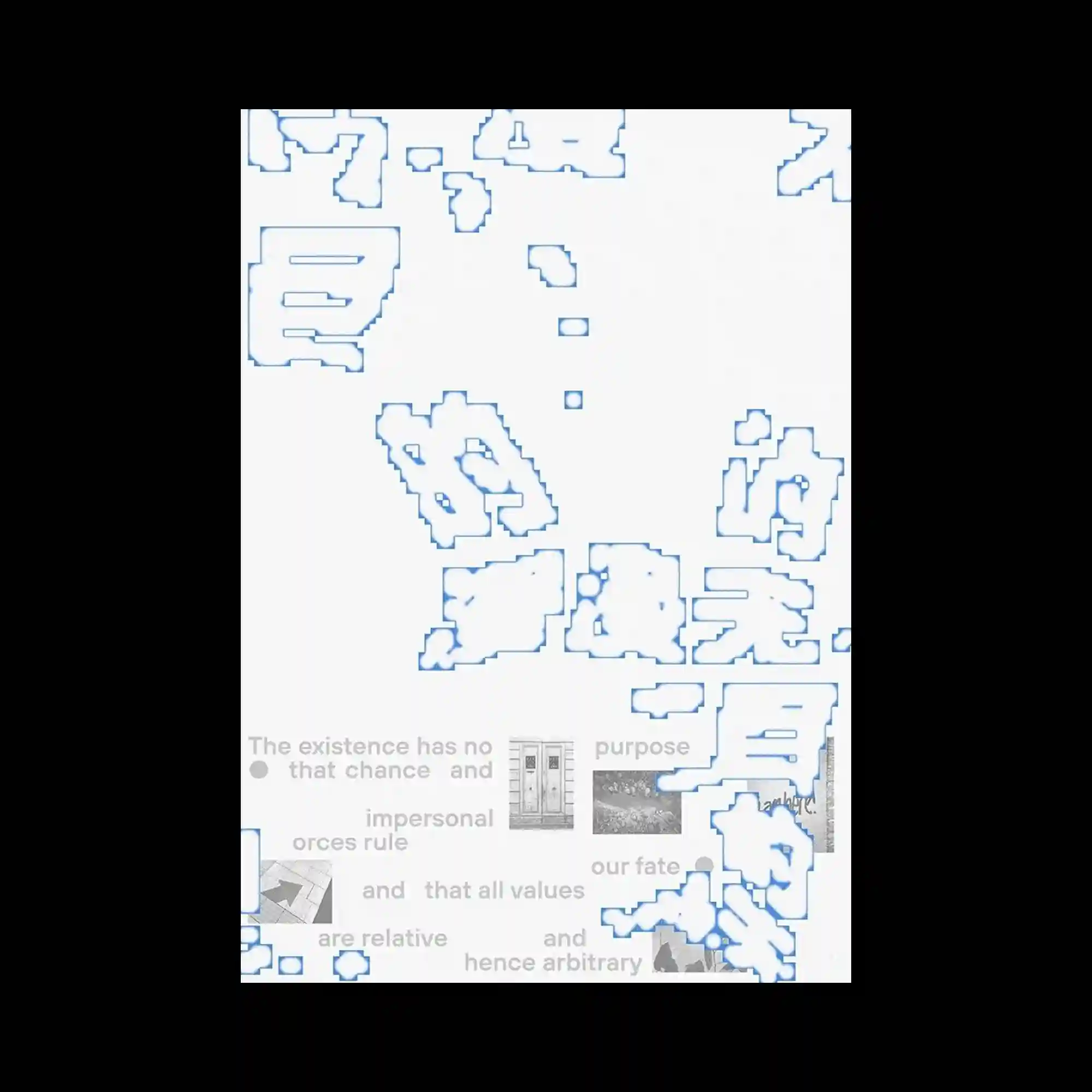Pixelated typographic fragments appear dispersed across the surface, rendered in low-resolution block forms with blue outlines. The fragmented shapes create a sense of digital erosion or incomplete rendering. Beneath these elements, faint grayscale imagery and text are partially visible, adding a secondary layer. The composition explores degradation and layering within a digital aesthetic.