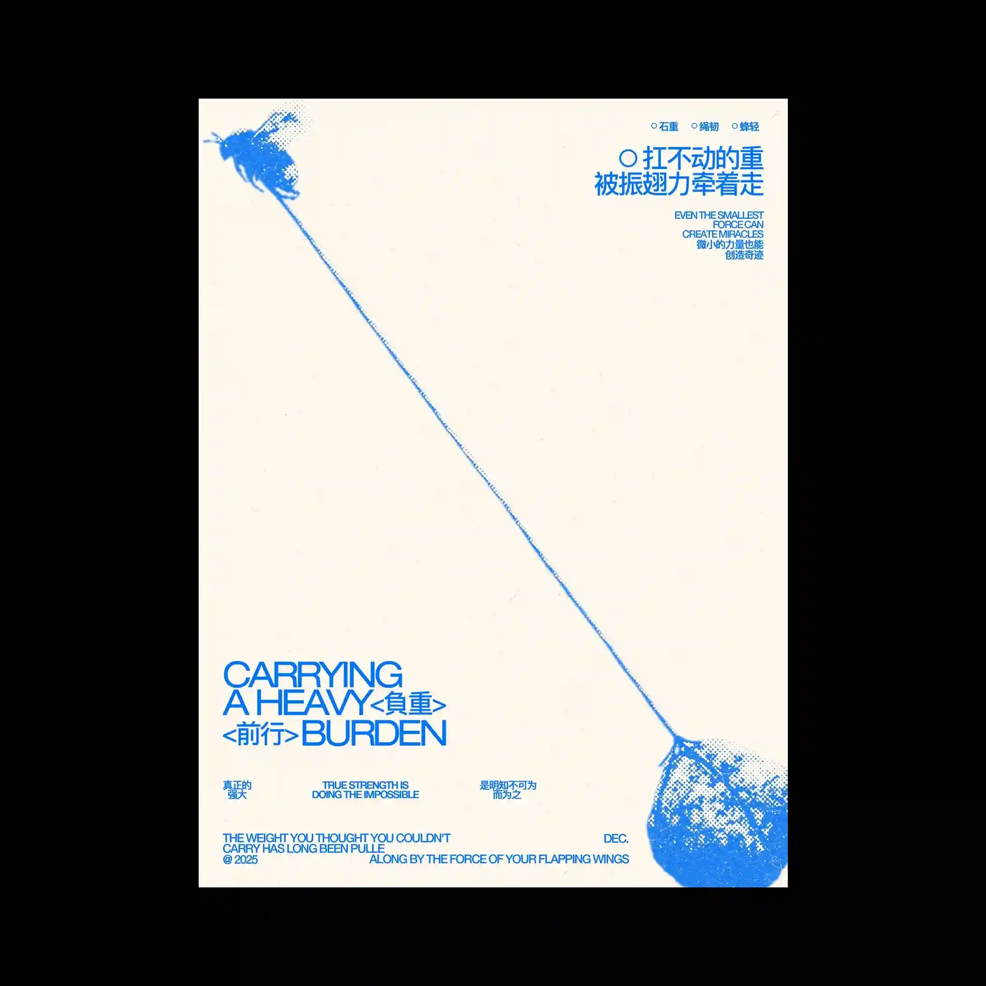 A single diagonal line connects two halftone-rendered masses positioned at opposite corners, creating a strong directional axis. The forms are rendered in blue dot patterns, emphasizing texture and weight through density variation. Minimal typography is placed around the composition, leaving large areas of empty space. The layout relies on tension between two points and the line that connects them.