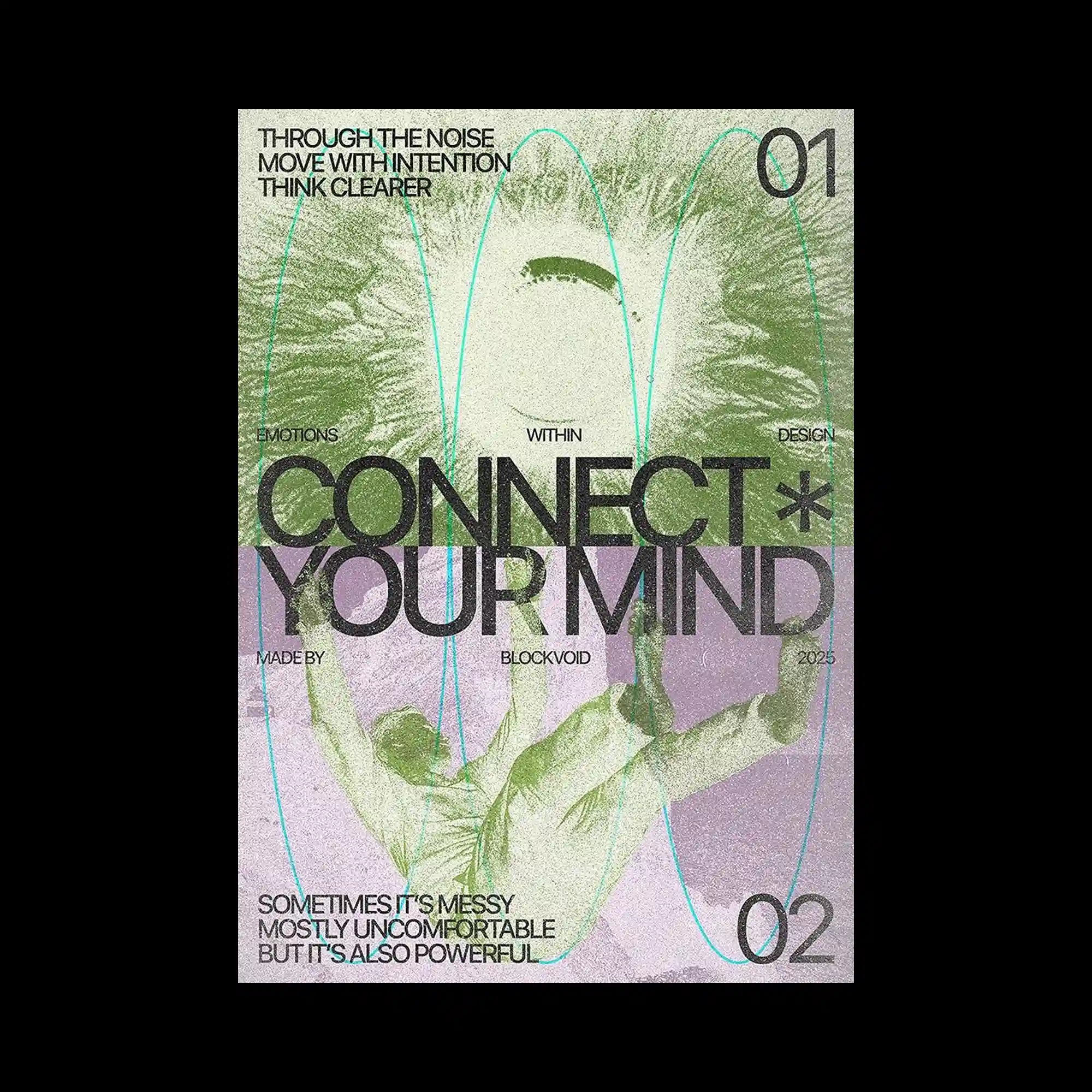A textured background with grain and noise is overlaid with bold central typography. Elliptical line forms repeat vertically, creating a rhythmic overlay that intersects the text. The color palette combines muted tones with subtle contrasts, enhancing depth without overwhelming the composition. The structure blends expressive texture with geometric repetition.