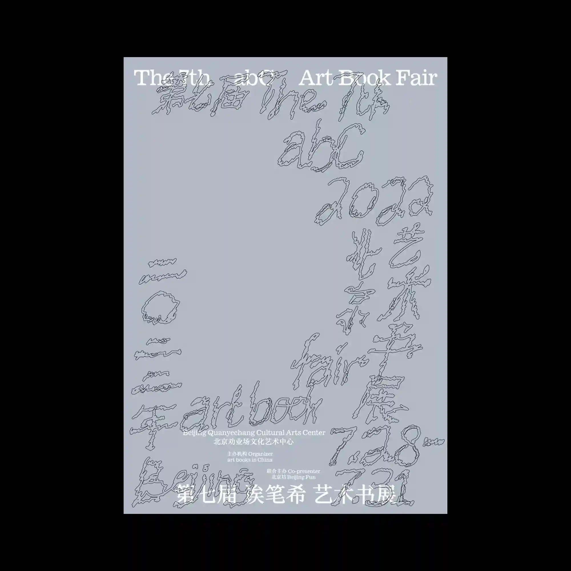 Thin outlined typography appears loosely scattered across the surface, with irregular stroke textures suggesting hand-drawn movement. The composition is largely open, with text elements distributed asymmetrically around the edges. Small blocks of information are aligned centrally, anchoring the otherwise dispersed layout. The design emphasizes lightness and spatial distribution.
