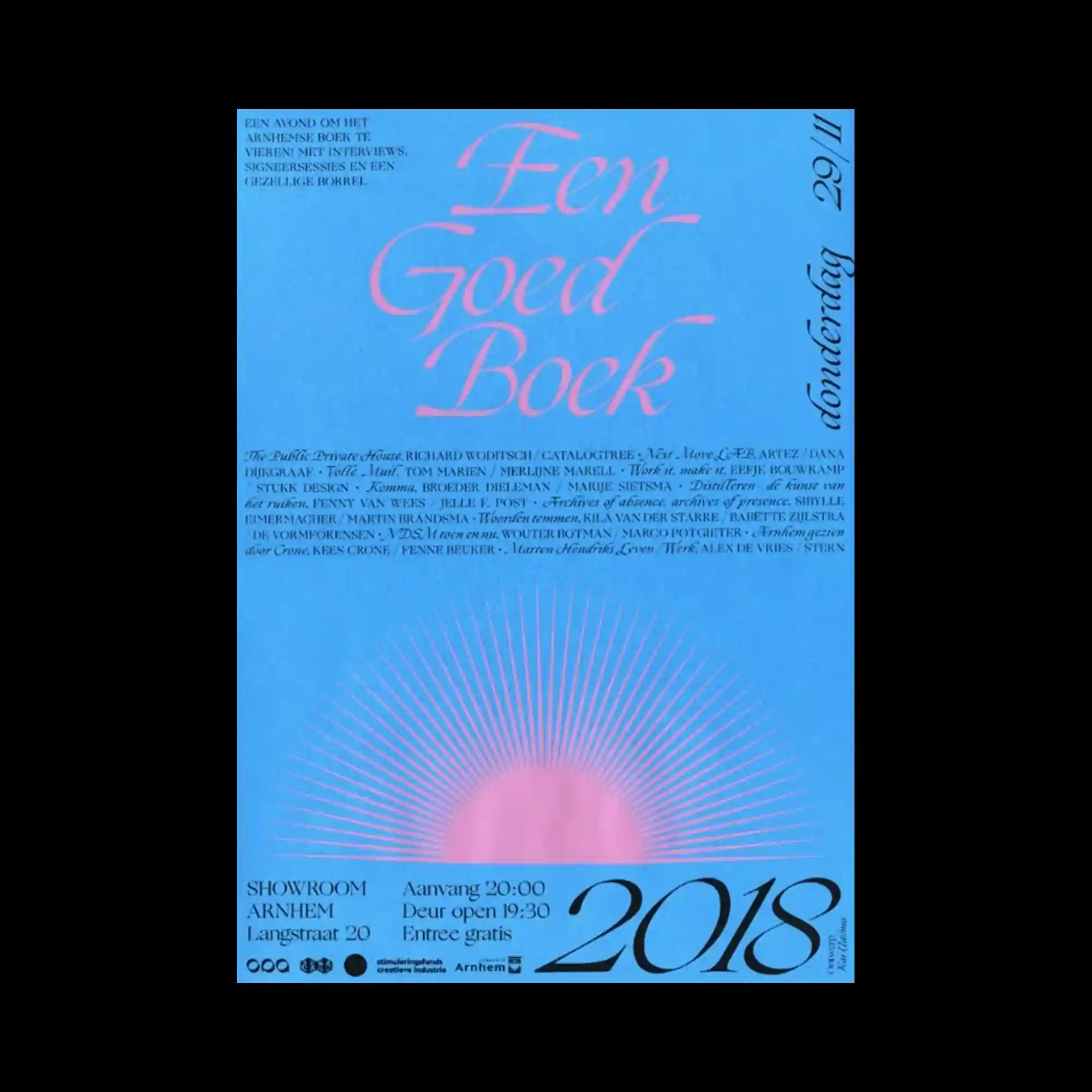 A smooth gradient field transitions from blue to pink, creating a soft atmospheric background. Large italic serif typography is centered and spaced generously, allowing the letterforms to float within the gradient. A radial burst graphic emerges from the lower center, reinforcing the focal point with directional lines. Supporting text is condensed into a horizontal strip, maintaining clarity without disrupting the main composition.