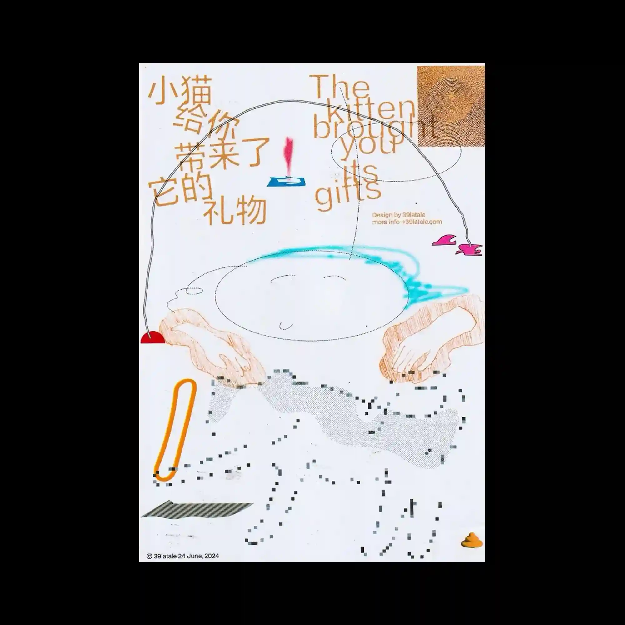 Soft, pixel-like shapes in pastel tones form an organic central figure with rounded edges. Above, small image blocks and text elements are aligned horizontally, introducing a contrasting rigid structure. The halftone-like rendering of the main form adds texture and visual softness. The composition juxtaposes playful organic imagery with structured typographic information.