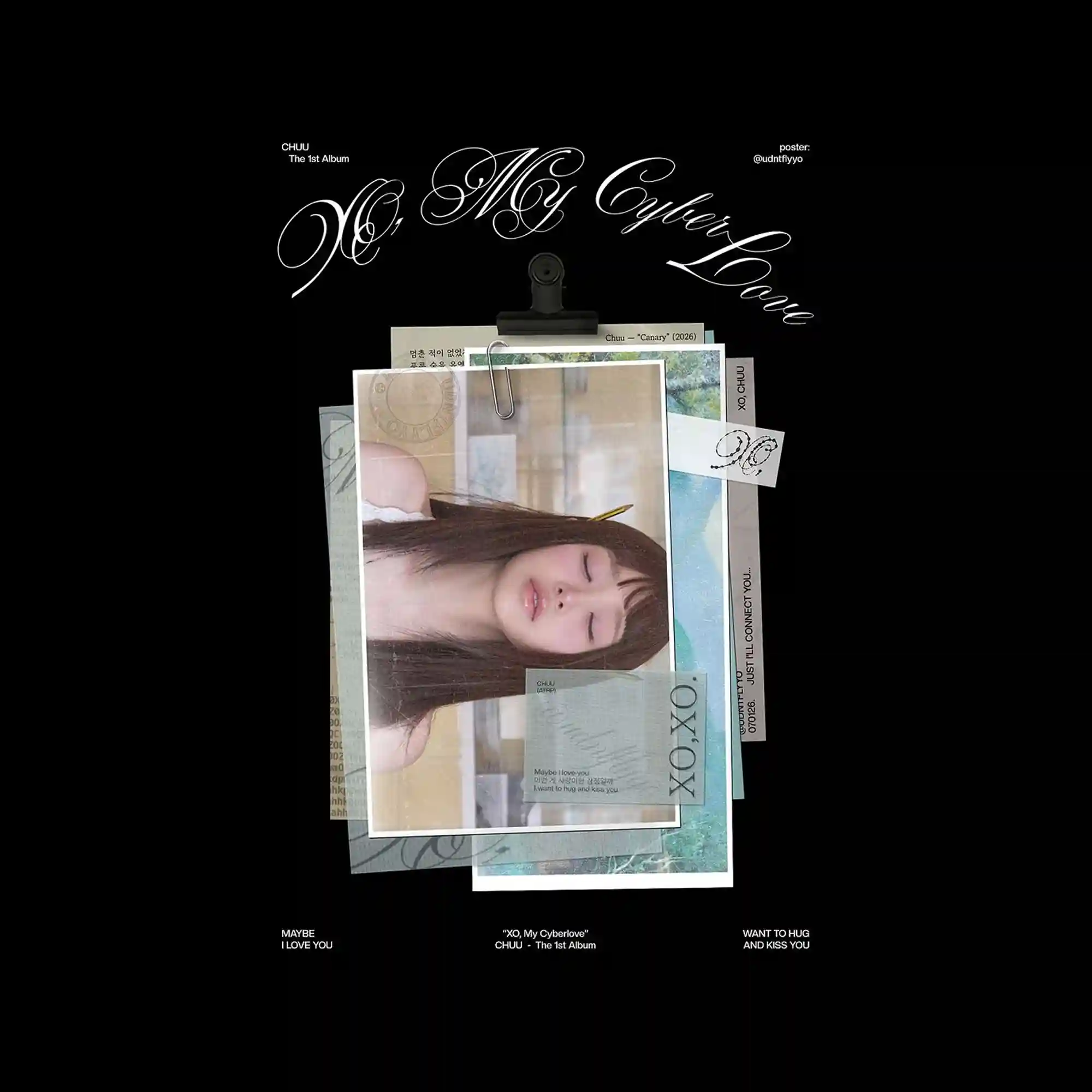 A collage of layered photographs is clipped together, creating depth through overlapping rectangular frames. The central portrait is framed by translucent overlays and paper textures, evoking a tactile composition. Decorative cursive typography arches across the top, contrasting with the structured image stack below. Small captions and labels are distributed around the edges, reinforcing the editorial layout.
