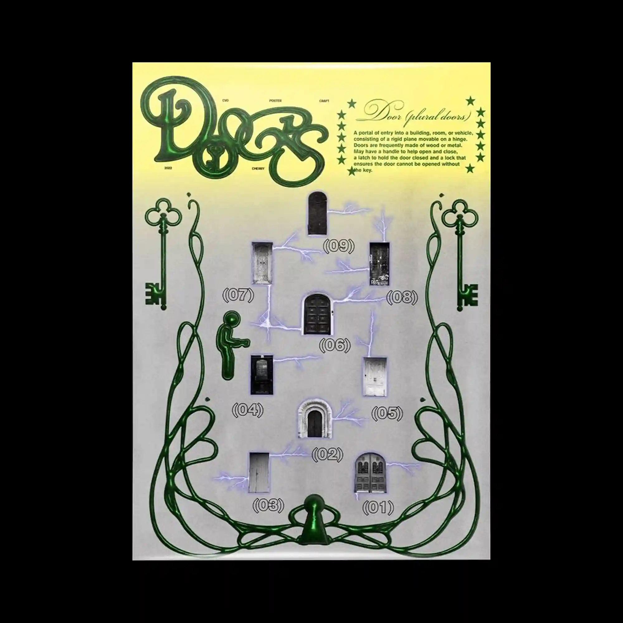 Dark silhouetted tree branches spread across the composition, forming an intricate network of organic lines over a green gradient field. Vertical beige panels containing condensed typography run along the left and right edges, framing the central imagery. In the middle, a stylized lightbulb illustration with elongated internal elements floats above the branches, creating a layered symbolic focal point. At the bottom, a large stretched wordmark extends horizontally, anchoring the layout with exaggerated letter spacing and scale contrast.