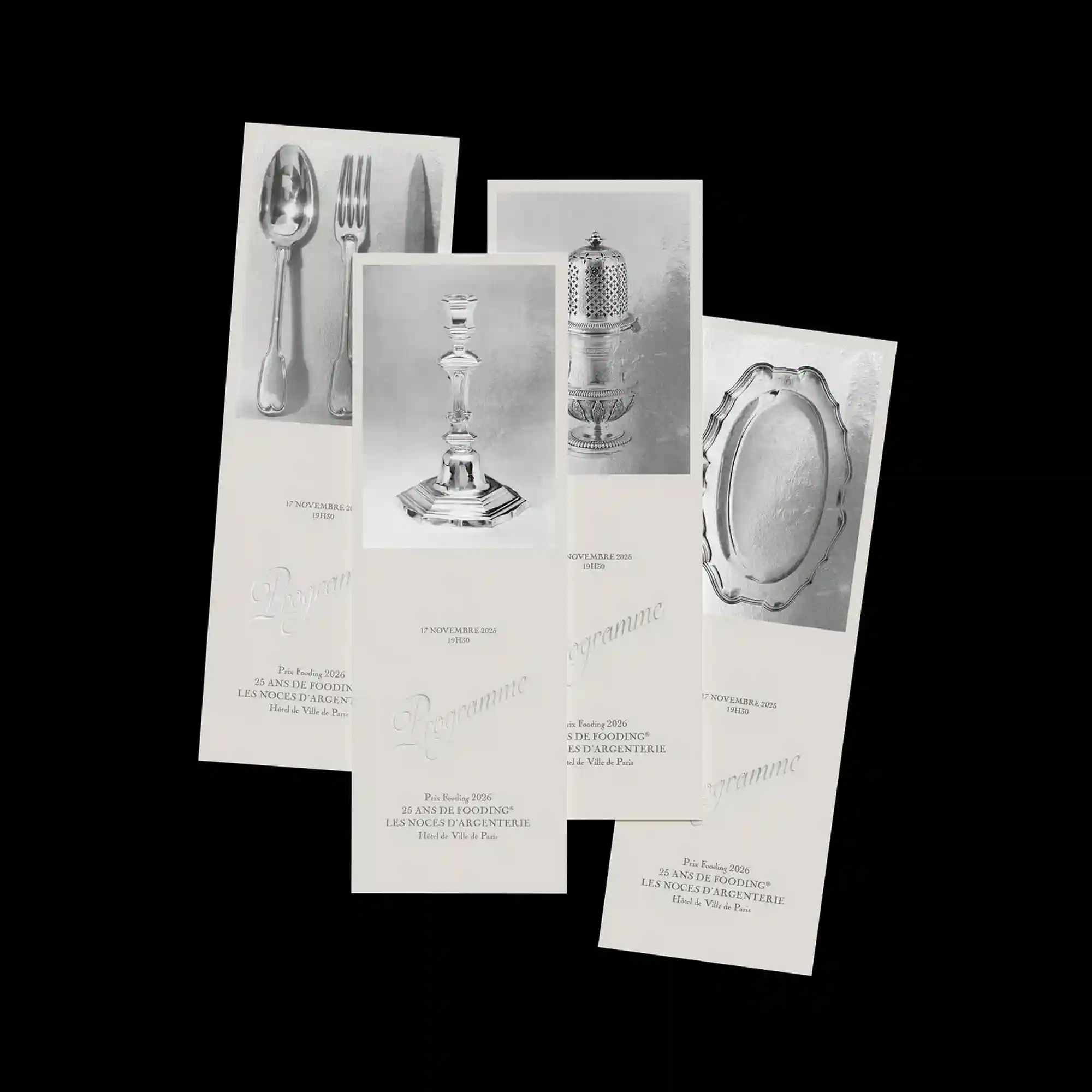 A series of monochrome photographs is arranged in overlapping vertical cards, creating a layered editorial composition. Each card features a central object with strong lighting, emphasizing texture and form. Subtle embossed typography appears beneath the images, blending into the surface with low contrast. The staggered alignment introduces depth while maintaining a restrained and refined aesthetic.