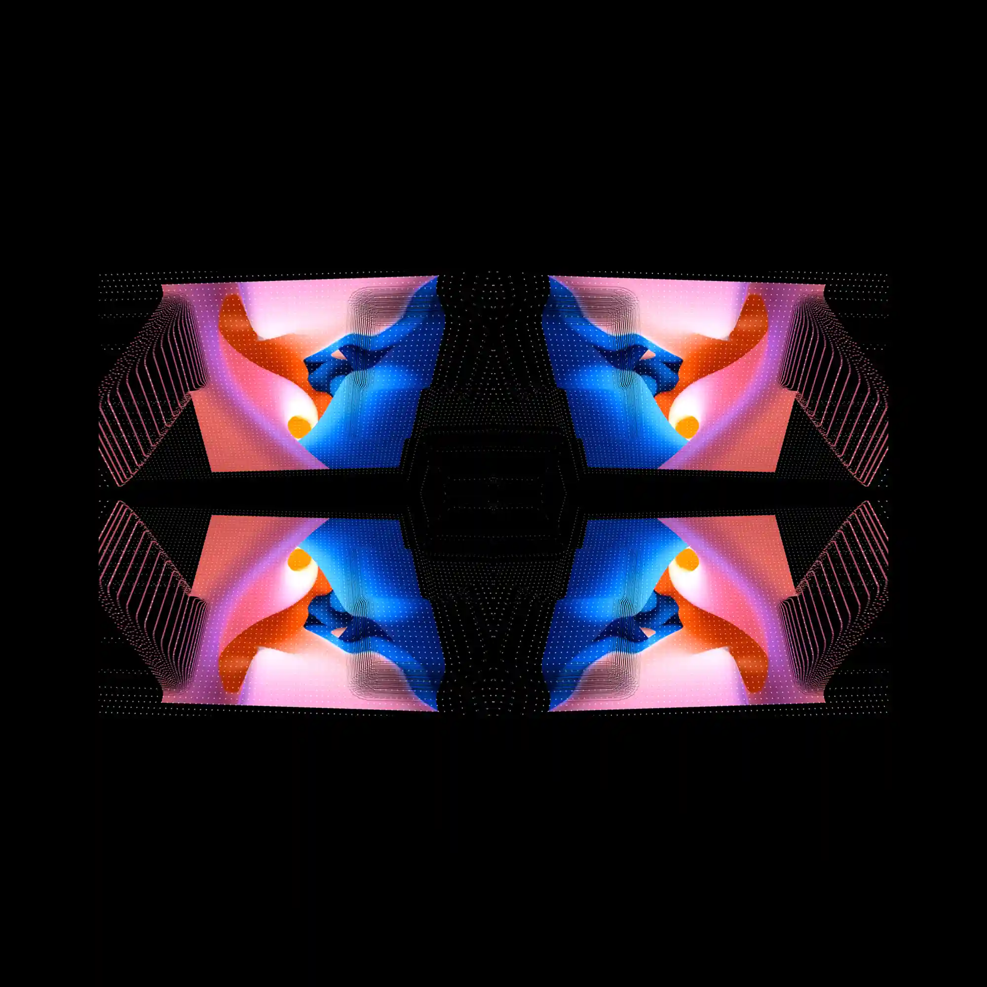 @nicoantwerp | The composition is symmetrical, with mirrored digital landscapes placed in a grid-like structure. Each quadrant contains a vivid gradient of blue, orange, and pink, forming abstract folded surfaces. Surrounding these forms, a fine network of dotted lines creates a three-dimensional framework, as if mapping the space. The center remains black, enhancing the contrast and symmetry. The result feels architectural, immersive, and cinematic in scale.