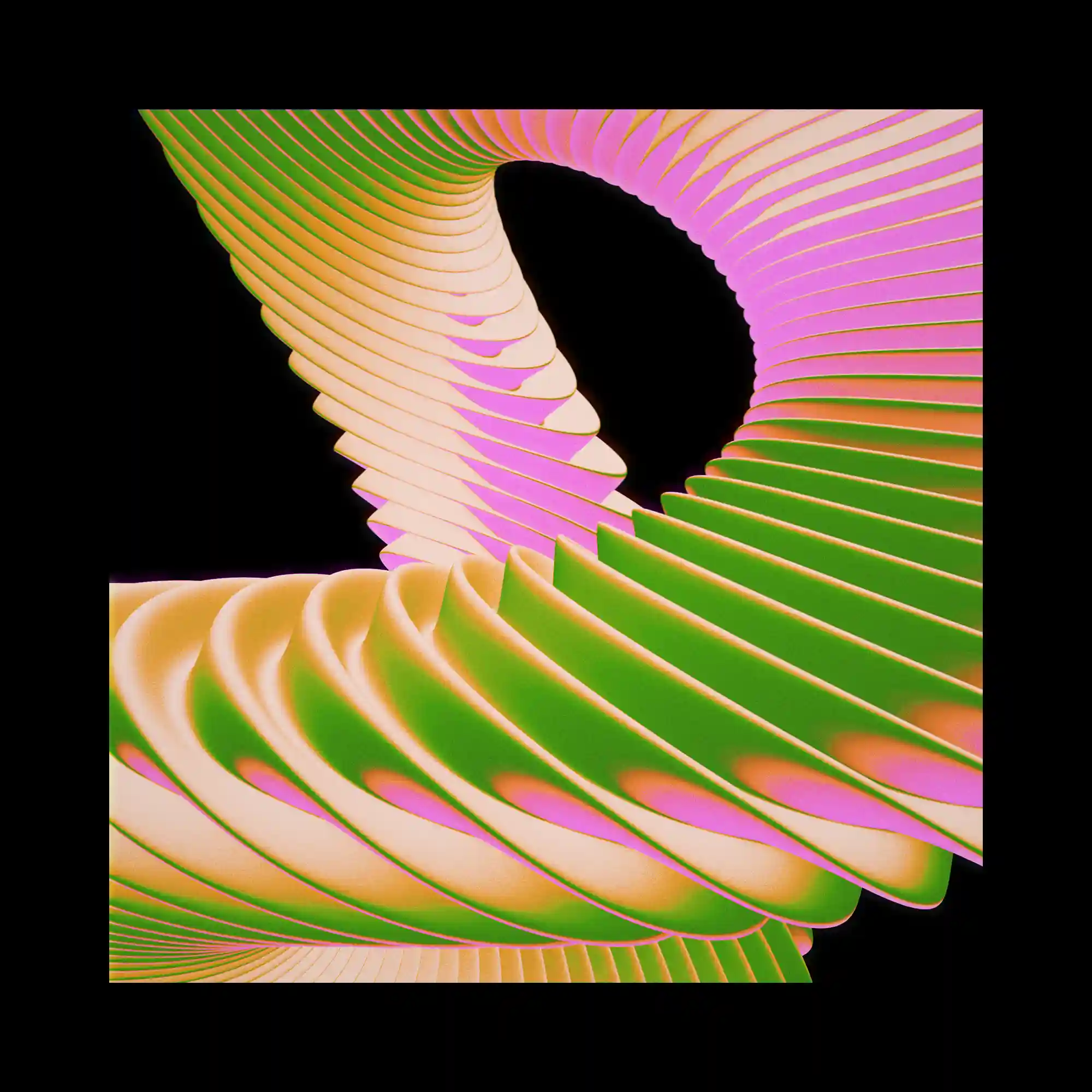 @nicoantwerp | The artwork presents a twisting ribbon-like structure composed of layered, fan-shaped segments. The forms shift between soft gradients of green, pink, and peach, creating a dynamic sense of depth and surface texture. The arrangement suggests a continuous loop, where each segment overlaps fluidly with the next. The black background heightens the vibrancy of the colors and emphasizes the sculptural qualities. Overall, the image balances organic fluidity with geometric repetition.