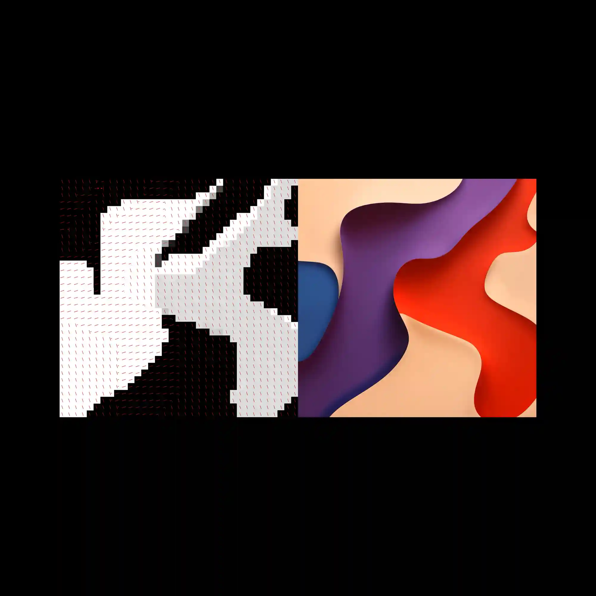 @nicoantwerp | The artwork is divided into two distinct halves, contrasting pixel-like abstraction with smooth organic curves. On the left, blocky grayscale shapes are overlaid with diagonal red lines, evoking a digital or coded texture. On the right, flowing forms in red, purple, beige, and blue create a soft, sculptural surface. The juxtaposition highlights the difference between rigid digital structures and fluid analog aesthetics. This duality creates a dynamic tension across the composition.