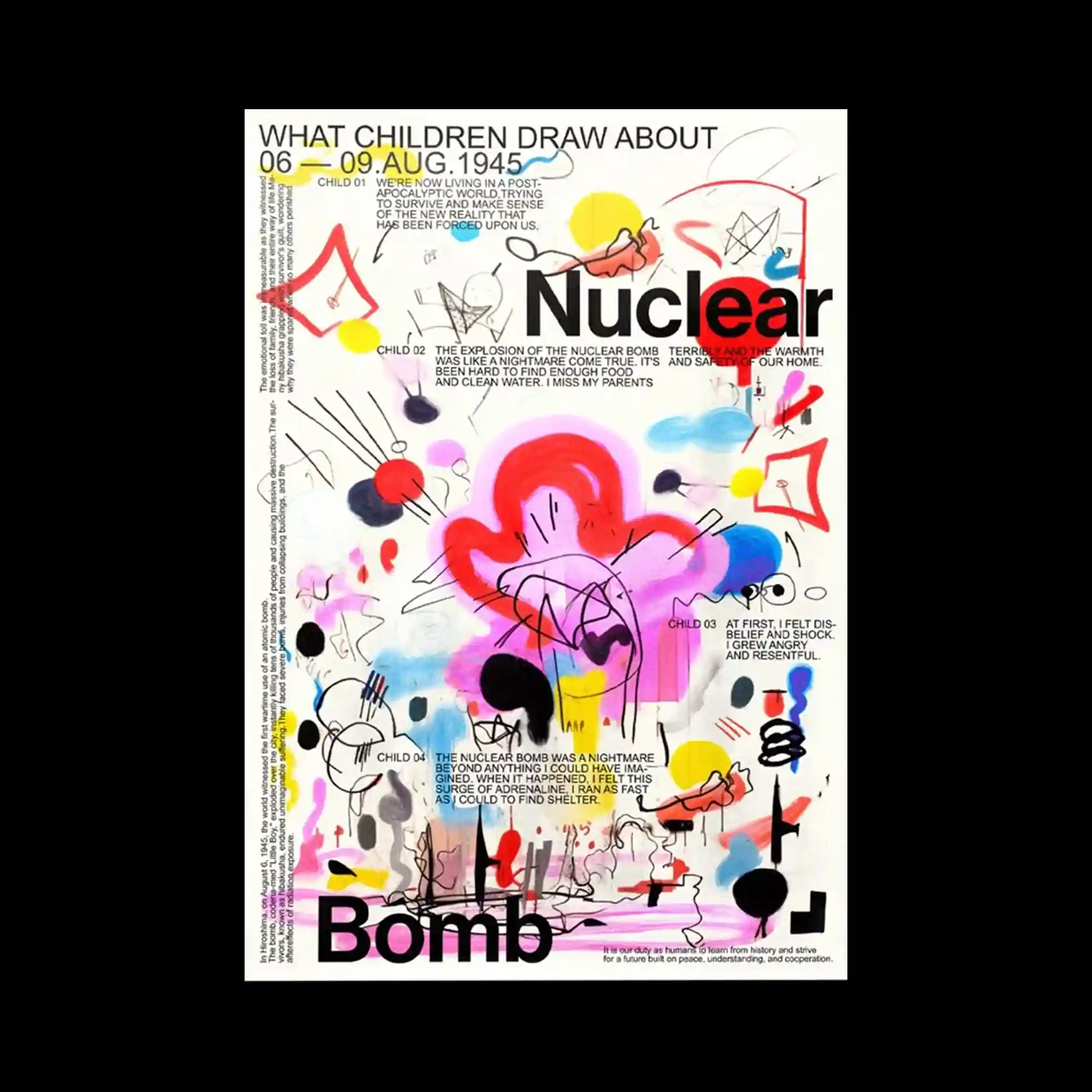 @jesusdesignedme | Child-like crayon scribbles and splashes overlay nuclear war reflections in chaotic storytelling.
